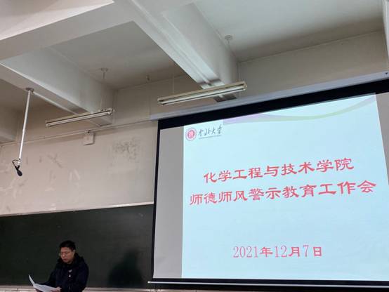 12月7日,化学工程与技术学院在10102H教室召开师德师风警示教育工作会议,学院全体院领导及教职工参加本次会议。会议由院党委书记廖海洪同志主持。