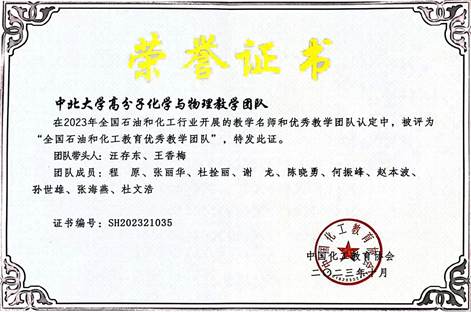 近日,中国化工教育协会发布《关于公布2023年全国石油和化工教育教学名师、优秀教学团队、优秀教学管理人员认定结果的通知》(中化教协发〔202349号)并颁发荣誉证书,授予我院贾广信教授“全国石油和化工教育教学名师”荣誉称号,授予汪存东副教授和王香梅教授负责的高分子化学与物理教学团队“全国石油和化工教育优秀教学团队”荣誉称号。本年度山西高校中只有以上两项荣誉获得认定。此前,我院已有焦纬洲教授和袁志国教授、化工原理教学团队分别获此殊荣。